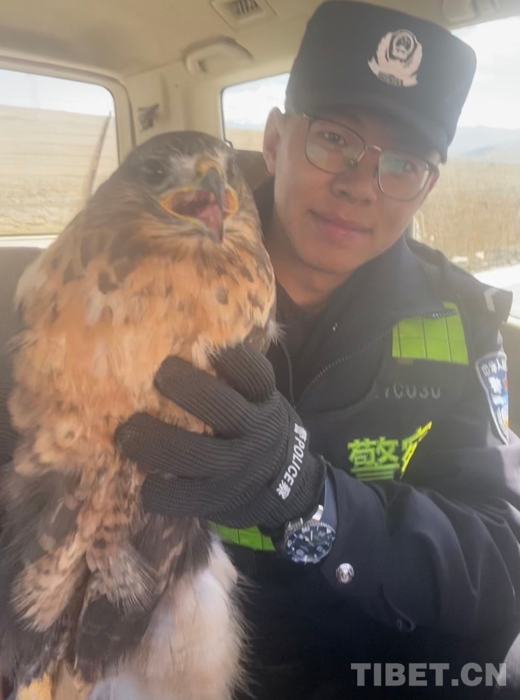 圖為民警與被救助的成年金雕 攝影:旦增多吉