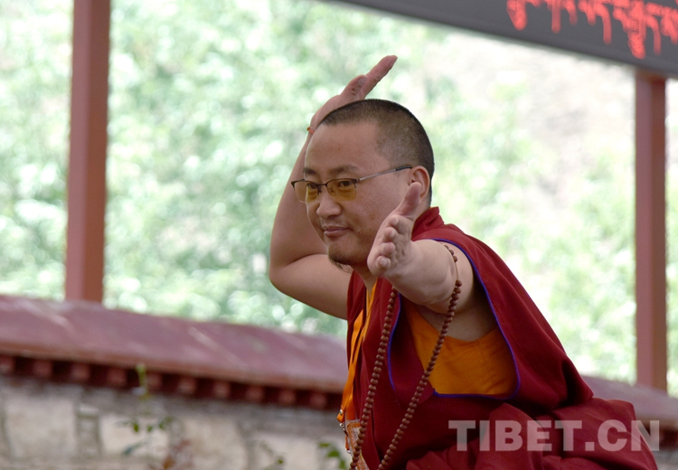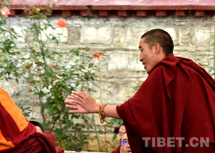 中國西藏網(wǎng)訊 身穿絳紅色袈裟,坐者仔細(xì)聆聽、站立者臂套念珠、迸出佛學(xué)妙語;圍觀者不時大笑……這是6月21日下午記者在西藏佛學(xué)院辯經(jīng)場看到的“唇槍舌戰(zhàn)”。
