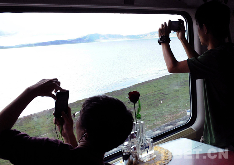 這是京藏列車在通過錯那湖時,旅客們紛紛用手機(jī)拍攝美景(唐召明2012年8月12日攝)