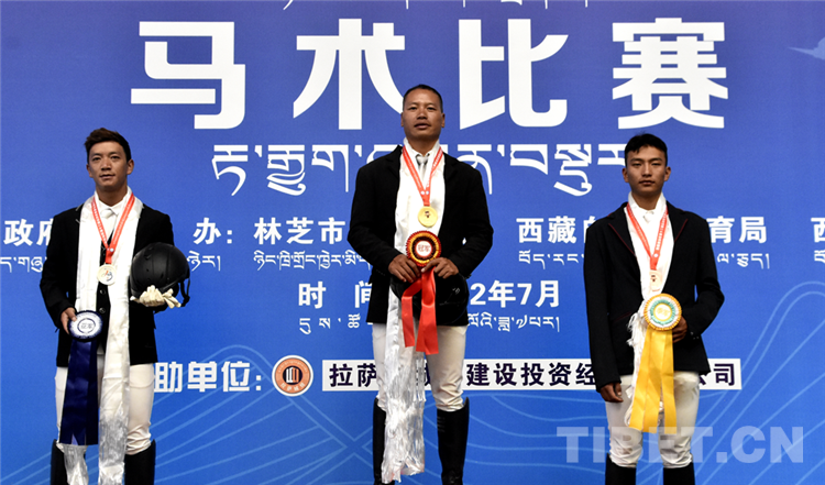 圖為7月17日競技馬術(shù)項目場地障礙個人賽頒獎現(xiàn)場(中間為冠軍選手日喀則市代表團(tuán)巴迪,左邊為亞軍選手山南市代表團(tuán)選手諾桑,右邊為季軍選手林芝市代表團(tuán)單增洛追) 攝影:德吉卓嘎