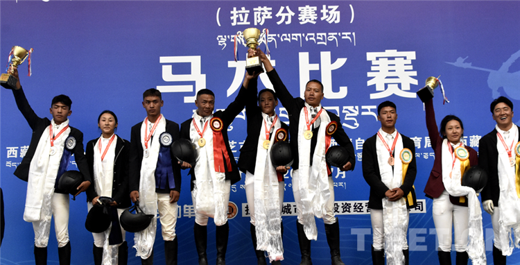 圖為7月17日競技馬術(shù)項目場地障礙團(tuán)體賽頒獎現(xiàn)場(中間為冠軍日喀則市代表團(tuán),左邊為亞軍那曲市代表團(tuán),右邊為季軍昌都市代表團(tuán)) 攝影:德吉卓嘎