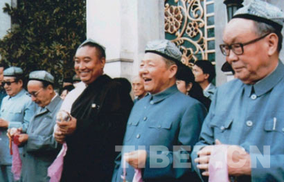 圖為習(xí)仲勛(右二)與烏蘭夫(右一)、十世班禪(右三)、賽福鼎?艾則孜(右四)、楊靜仁(右五)在北京民族文化宮。圖片來源:《中國西藏》雜志