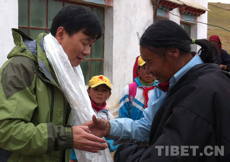 這是王飛(左)在“下鄉(xiāng)”時(shí),牧民群眾給他敬獻(xiàn)哈達(dá)(唐召明提供,2013年8月29日攝)
