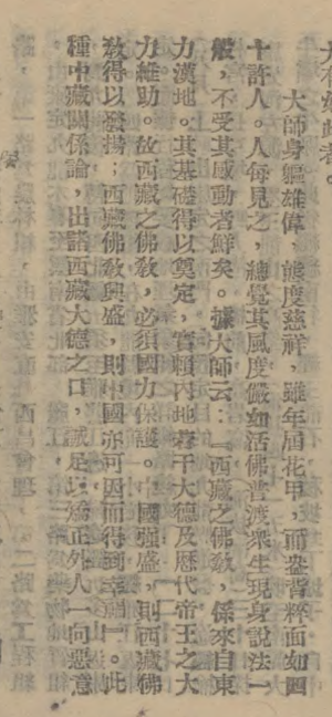 次年,應(yīng)重慶漢藏教理院和成都佛學(xué)社的邀請,東本格西決定前往當(dāng)?shù)刂v法。期間,日本空襲不斷,拉薩官民與弟子因憂慮東本格西安危,力勸其勿前往。但是,東本格西從佛教利益世間的角度出發(fā),認(rèn)為在當(dāng)?shù)孛癖娍嚯y之際,作為僧人更應(yīng)不懼危險,前往當(dāng)?shù)匚拷迕癖姡约偨鈶?zhàn)爭造成的創(chuàng)傷與苦痛。1943年1月,東本格西從拉薩啟程前往理化(今理塘),參加九世班禪靈童尋訪測驗事宜。4月,經(jīng)由康定抵達(dá)成都,沿途受到各地政府官員與僧俗弟子的歡迎。東本格西應(yīng)中國邊疆問題研究會邀請講演“佛教與邊疆”,蒙藏委員會委員格桑澤仁翻譯。[3]講演內(nèi)容主要分為三部分:首先,詳細(xì)敘述藏傳佛教發(fā)展演變的歷史,提出因于歷代高僧與中央政府的大力維護與資助,藏傳佛教發(fā)展的基礎(chǔ)才得以奠定;其次,分析邊疆佛教的分布與信仰狀況;最后,分析佛教與邊疆的關(guān)系。[4]他在講到佛教昌盛與國家實力發(fā)展之間的關(guān)系時,明確提出“西藏之佛教,必須國力保護,中國強盛,則藏傳佛教得以發(fā)揚,藏傳佛教興盛,則中國亦可因而得到幸福”[5]。東本格西從歷史和現(xiàn)實角度詮釋西藏作為中華民族共同家園的角色,邊疆不惟具體的地理概念和信仰文化差異的標(biāo)簽,而是中央政府長期支持發(fā)展的歷史凝結(jié),是中華民族共同家園的一分子。