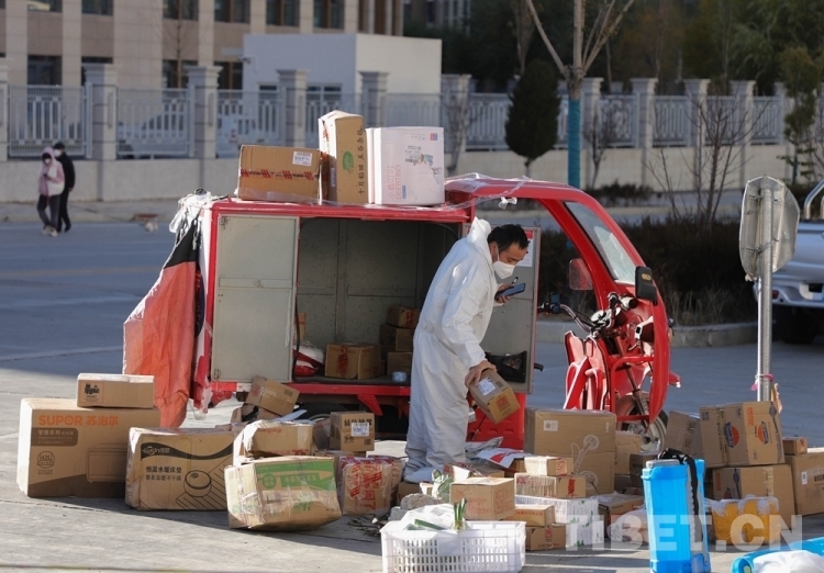 中國(guó)西藏網(wǎng)訊 隨著拉薩市疫情防控形勢(shì)整體持續(xù)向好,目前拉薩市郵政快遞業(yè)在落實(shí)好常態(tài)化疫情防控工作的基礎(chǔ)上,正有序復(fù)工復(fù)產(chǎn)。圖為快遞員無(wú)接觸配送快遞 攝影:賈華加(中國(guó)西藏網(wǎng) 記者/賈華加)