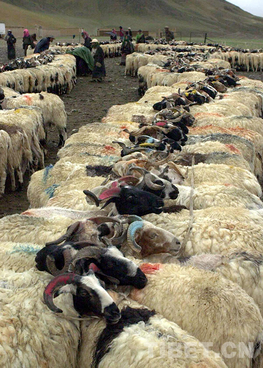 這是藏北雙湖特別區(qū)(現(xiàn)雙湖縣)嘎措鄉(xiāng)牧人用繩子統(tǒng)一拴住羊群角后,準(zhǔn)備擠羊奶。該鄉(xiāng)是西藏唯一的一個(gè)走集體化經(jīng)營道路的鄉(xiāng)村(唐召明2001年攝)