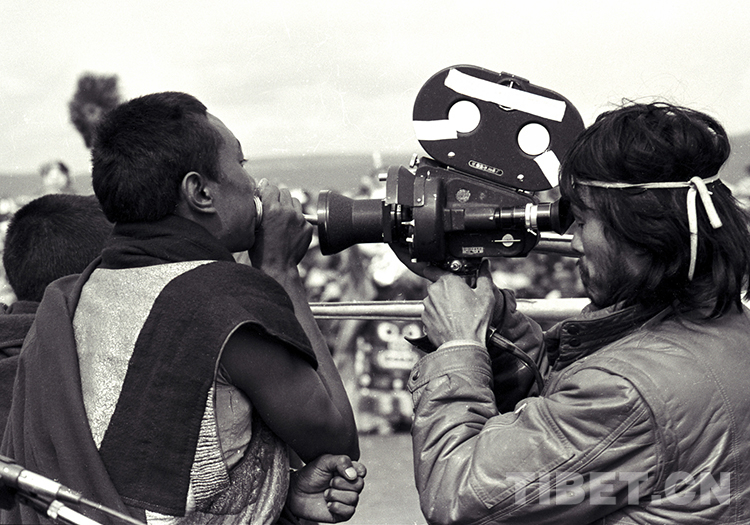 這是北京科學(xué)教育電影制片廠《萬里藏北》攝制組導(dǎo)演忻迎一,在那曲賽馬會(huì)上拍攝吹長號(hào)的僧人(唐召明1988年攝)