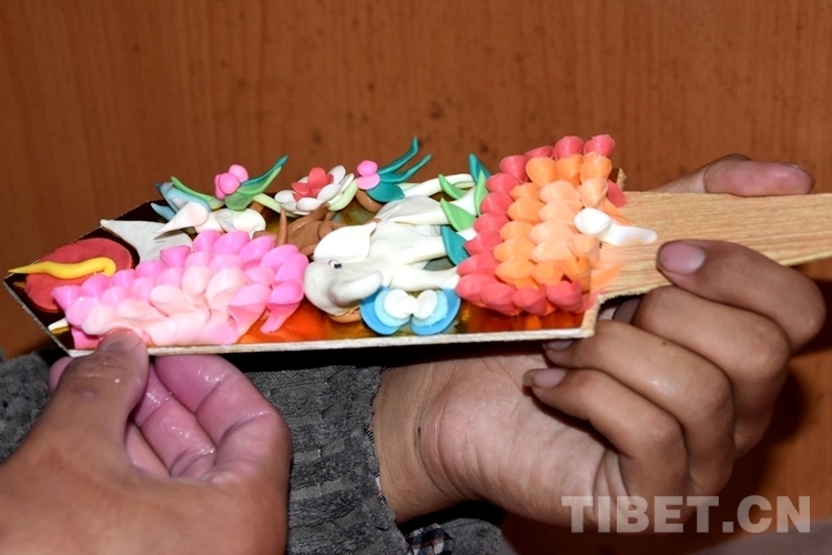 酥油花是藏民族雕塑藝術(shù)的一種特殊形式,它是以人物、花卉、樹木、飛禽、走獸等為主題的一種手工油塑藝術(shù),具有悠久的歷史。藏歷新年期間,西藏群眾會在切瑪盒的左右兩邊分別裝滿糌粑和炒青稞,然后在上面插上象征五谷豐登的“羅薩美朵”(彩色青稞穗)和寓意吉祥的酥油花。(中國西藏網(wǎng) 記者/次旦拉姆)