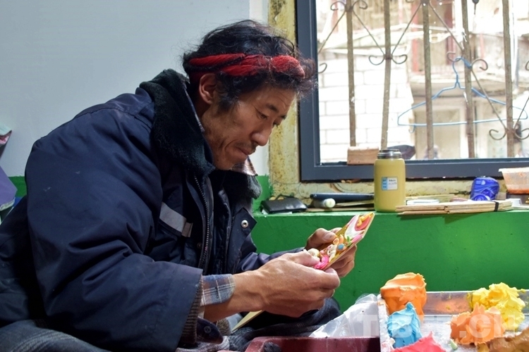 “我們一般在藏歷新年前20天左右到達(dá)拉薩。買酥油,和礦物染色原料調(diào)至成泥狀后便開始捏制。”旦增說,普松鄉(xiāng)有制作酥油花的傳統(tǒng),每年藏歷新年臨近,他們便結(jié)伴來到拉薩制作酥油花銷售。
