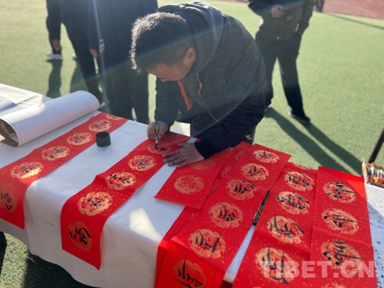 中國西藏網(wǎng)訊 2月16日,西藏自治區(qū)文聯(lián)主辦的“我們的中國夢”——文化進萬家活動在極高海拔生態(tài)搬遷安置點開展。在送“書法”現(xiàn)場,由西藏書法協(xié)會和山南市11位書法家為當(dāng)?shù)厝罕娝腿?00多張寓意美好的新年祝福和群眾期望的新年祝愿等。活動現(xiàn)場群眾絡(luò)繹不絕,大家心滿意足地拿著書法家為自己贈送的精美“禮品”。一旁書法家們忙碌地為群眾書寫祝詞,另一旁群眾們晾曬著他們得到的書法作品,一時間現(xiàn)場成了“書法展”,時不時地有人前來參觀欣賞。(中國西藏網(wǎng) 記者/德吉卓瑪)
