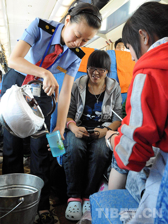 這是被藏族旅客稱為“格?;ā钡木┎剀囮犎M乘務員魏若思在唐古拉山段為旅客送水(唐召明2010年7月4日攝)