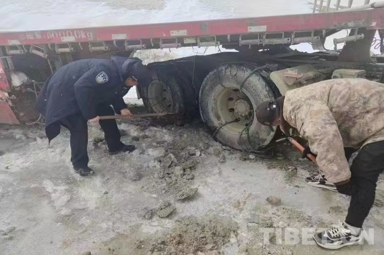 民警抵達(dá)現(xiàn)場,首先確認(rèn)了司機(jī)身體狀況良好。在了解情況后,與司機(jī)共同對車輛開展救援工作。經(jīng)過一段時(shí)間努力,仍無法將被困車輛拖離被困地。經(jīng)與司機(jī)協(xié)商決定,先行將其帶至曲松鄉(xiāng)妥善安頓,而后協(xié)調(diào)駐地友鄰單位用重型車輛救援被困車輛。最終在友鄰單位的幫助下,被困近20小時(shí)的半掛車成功脫困。