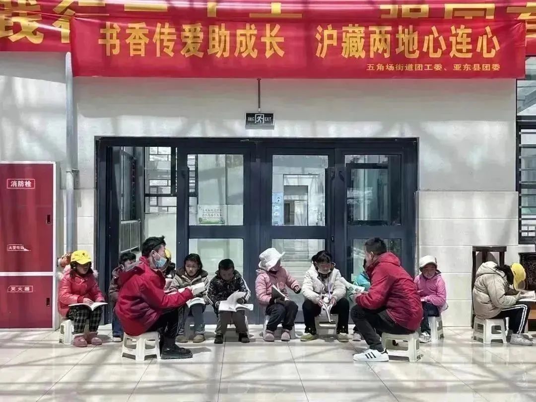 圖為亞東縣團縣委組織西部志愿者赴堆納鄉(xiāng)小學(xué)開展“書香傳愛助成長,滬藏兩地心連心”校園讀書節(jié)活動暨上海五角場街道團工委公益捐書儀式現(xiàn)場