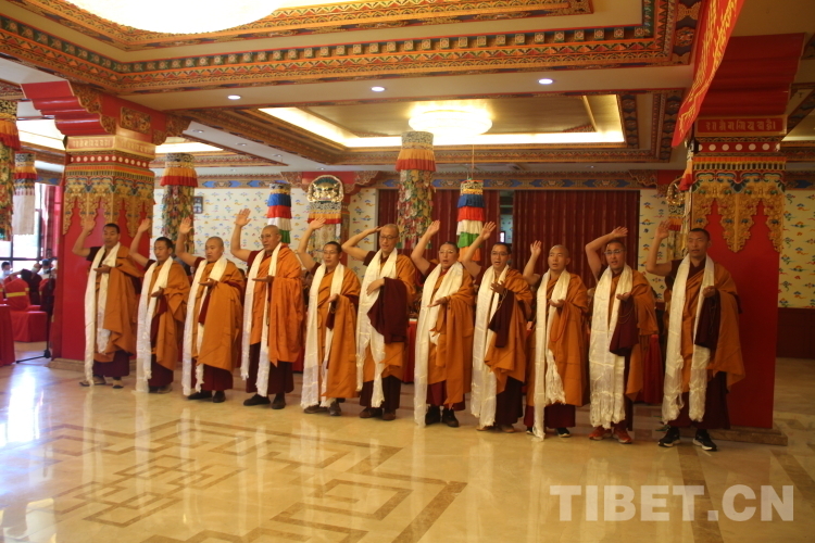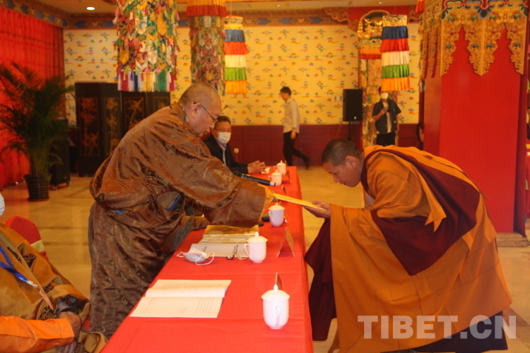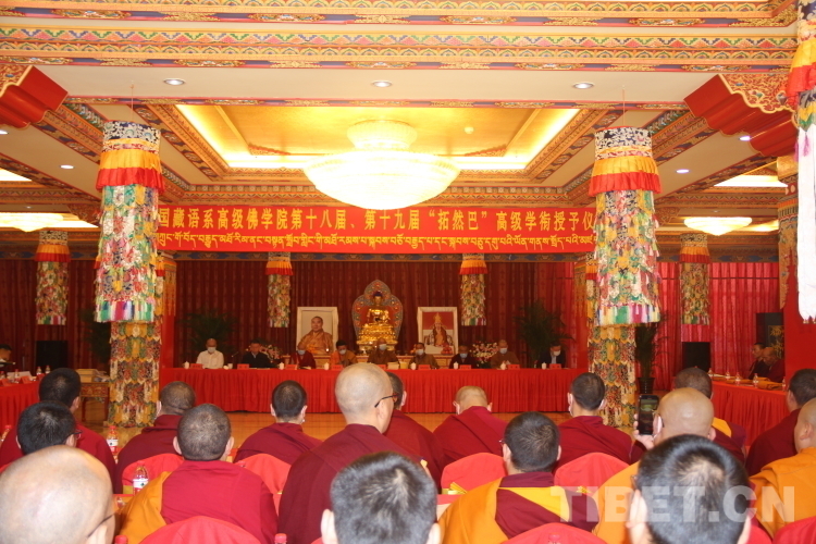 中國佛教協(xié)會副會長、藏傳佛教學銜工作指導委員會主任、中國藏語系高級佛學院院長嘉木樣活佛向“拓然巴”高級學銜獲得者頒發(fā)學銜證書。中國佛教協(xié)會副會長、藏傳佛教學銜工作指導委員會副主任珠康·土登克珠活佛向“拓然巴”高級學銜獲得者表示祝賀。