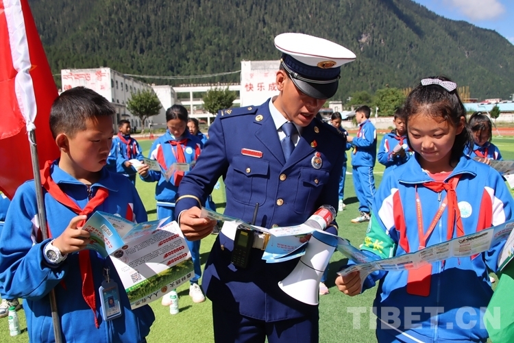 圖為執(zhí)勤分隊向?qū)W生開展防火宣傳工作