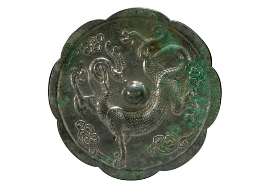 此件青銅龍紋鏡為葵花形,鏡背以紐為中心,龍紋為單體,呈蟠曲狀,四周分布云紋。龍的長(zhǎng)角翹起,巨口張開,身體遒勁,脖頸細(xì)長(zhǎng),似在回首戲珠。唐代有帝王在千秋節(jié)向群臣頒賜銅鏡之俗,這種賜予臣下的銅鏡多以龍紋裝飾,稱千秋鏡或天子鏡。也許是天子所賜,所以此龍的姿態(tài)看上去遒勁有力,同時(shí)又顯得生動(dòng)活潑,仿佛在每日的使用中能給人以活力。(中國(guó)西藏網(wǎng)綜合/周晶)