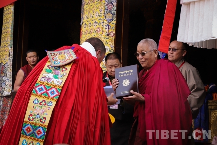 在頒證儀式上,西藏自治區(qū)政府副秘書長(zhǎng)高寶軍,西藏自治區(qū)黨委統(tǒng)戰(zhàn)部常務(wù)副部長(zhǎng)、自治區(qū)宗教事務(wù)局局長(zhǎng)趙樹明受自治區(qū)領(lǐng)導(dǎo)委托,代表西藏自治區(qū)人民政府向獲得學(xué)位的考僧贈(zèng)送五彩緞、干果、袈裟和禮金。佛協(xié)西藏分會(huì)副會(huì)長(zhǎng)、扎什倫布寺堪布噶欽?多吉堅(jiān)贊致賀詞,并代表班禪額爾德尼?確吉杰布會(huì)長(zhǎng)向獲得學(xué)位的考僧獻(xiàn)哈達(dá),頒發(fā)學(xué)位證書。