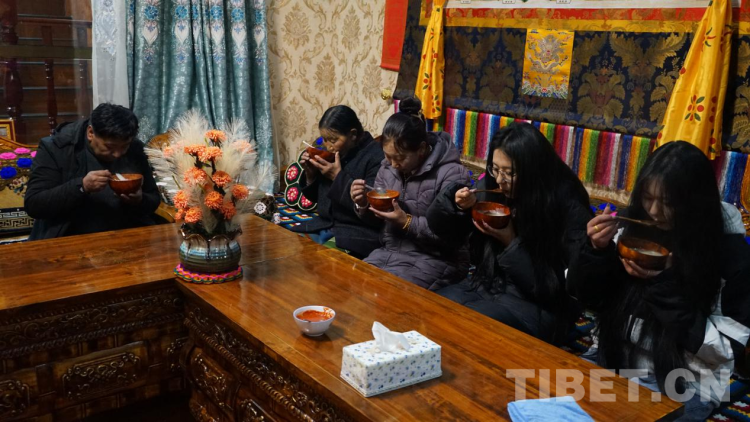 下午時(shí)分,“古突”夜的準(zhǔn)備就開始了,先是將羊肉放入鍋中燉煮,再是將白蘿卜切片備好,隨后與奶奶、兩個(gè)女兒及丈夫,一家人圍坐在溫暖的廚房說(shuō)說(shuō)笑笑地捏“古突”里的面疙瘩,做面疙瘩時(shí),要準(zhǔn)備一些稍大的特殊面疙瘩,分別包進(jìn)寫有石子、辣椒、羊毛、木炭等字樣的紙條,代表“心腸硬”“刀子嘴”“心腸軟”“黑心腸”等含義,待到吃“古突”環(huán)節(jié),來(lái)一場(chǎng)藏式風(fēng)格的“開盲盒”,據(jù)說(shuō)每個(gè)人吃到的字樣能在某種程度上代表新一年的運(yùn)勢(shì)或性格。