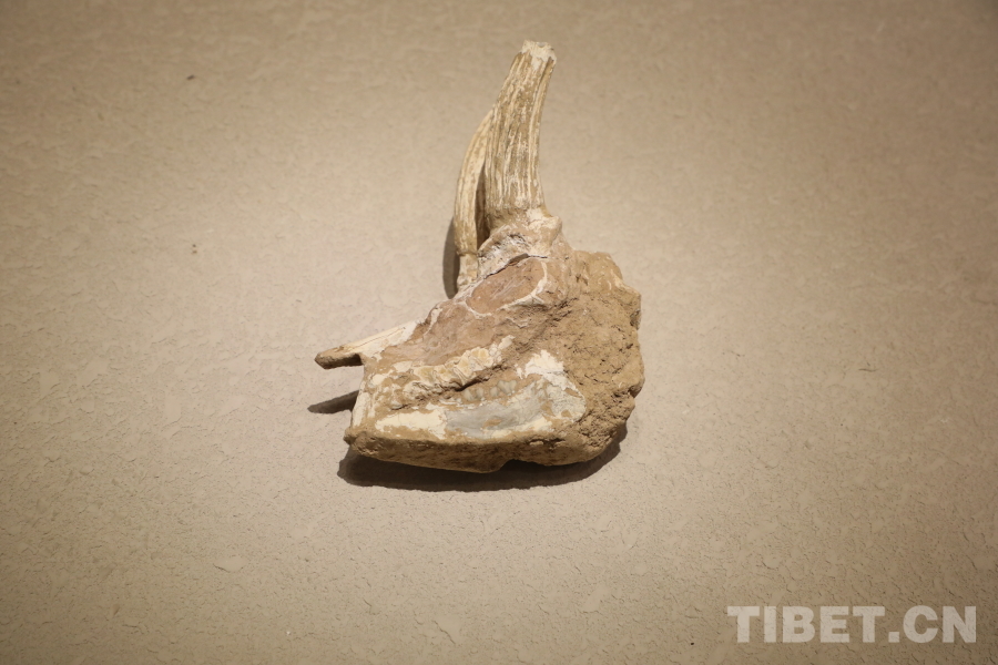 圖為新近紀羚羊頭骨化石 攝影:龍真多吉