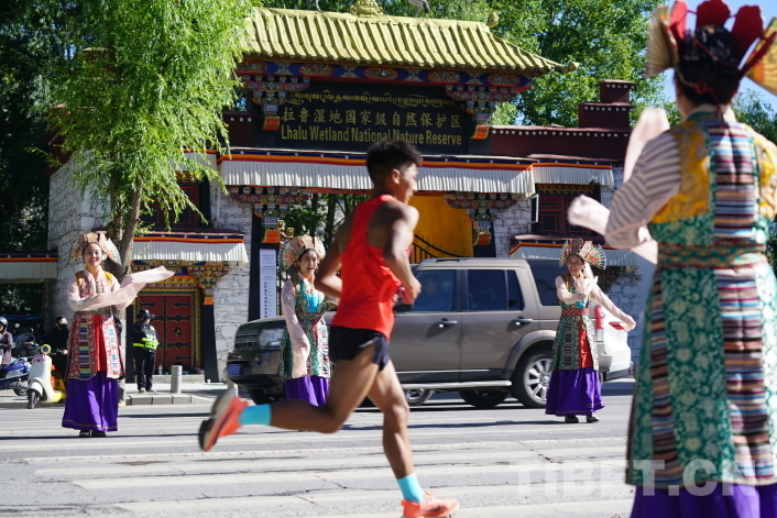 圖為 2024拉薩半程馬拉松18公里處參賽選手途經(jīng)拉魯濕地國(guó)家級(jí)自然保護(hù)區(qū),拉薩市城關(guān)區(qū)藏戲藝術(shù)團(tuán)以藏戲的形式為選手加油助威 攝影:趙振宇