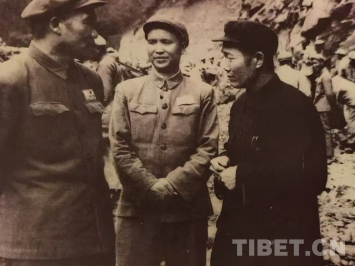 圖為1953年秋,西南軍區(qū)副司令員兼參謀長(zhǎng)李達(dá)代表賀龍司令員慰問川藏公路筑路部隊(duì)官兵,陳明義(中)、穰明德陪同李達(dá)(左一)在西藏波密視察公路修建進(jìn)展 圖由陳亦軍提供