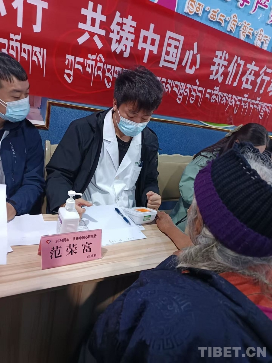 圖為中國(guó)康復(fù)研究中心普外科專家范榮福為當(dāng)?shù)厝罕娍丛\ 攝影:賈春玲