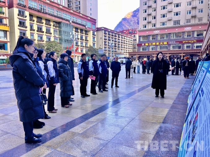 圖為援藏干部在雅江縣廣場上觀看展板 攝影:龍真多吉