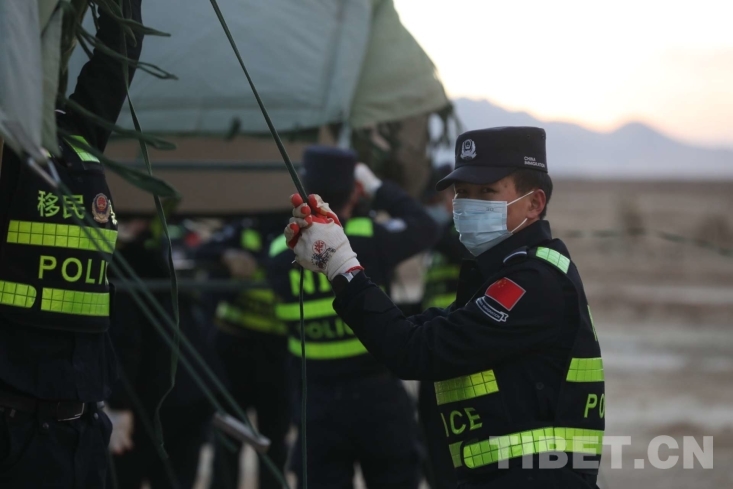 圖為西藏移民管理警察為受災(zāi)群眾搭建帳篷 攝影:郭遠(yuǎn)敬