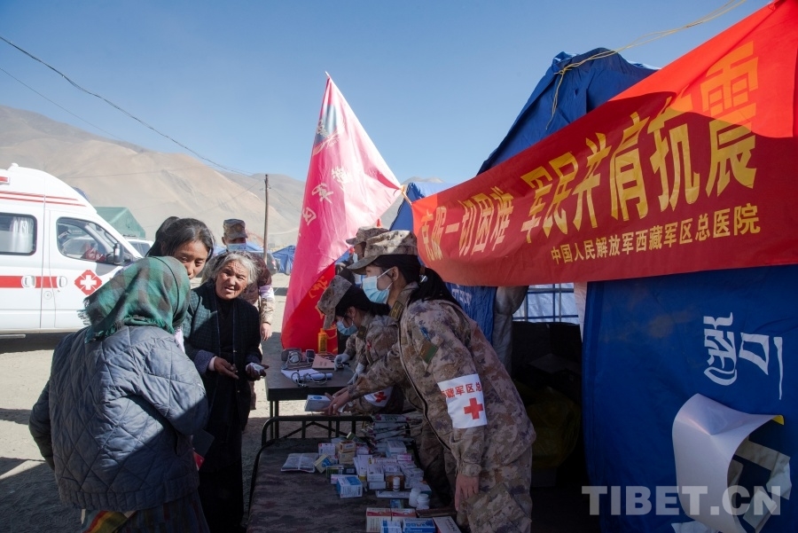 圖為中國人民解放軍西藏軍區(qū)總醫(yī)院醫(yī)務(wù)人員正在森嘎村向受災群眾提供醫(yī)療服務(wù) 攝影:趙振宇