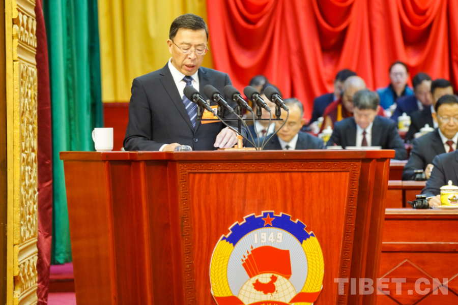 圖為西藏自治區(qū)政協(xié)黨組副書記、副主席孟曉林受全國政協(xié)副主席、西藏自治區(qū)政協(xié)主席帕巴拉·格列朗杰委托,代表政協(xié)第十二屆西藏自治區(qū)委員會常務(wù)委員會向大會作工作報告 攝影:趙振宇