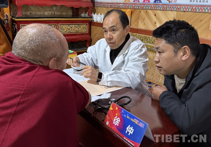 圖為醫(yī)療專家們在草登寺義診,廣州醫(yī)科大學(xué)附屬第三醫(yī)院老年醫(yī)學(xué)科主任、主任醫(yī)師徐仲正在與草登寺僧人溝通病情 攝影:喇應(yīng)強(qiáng)