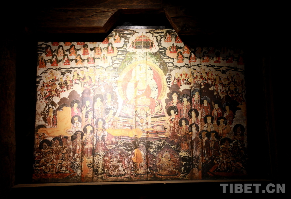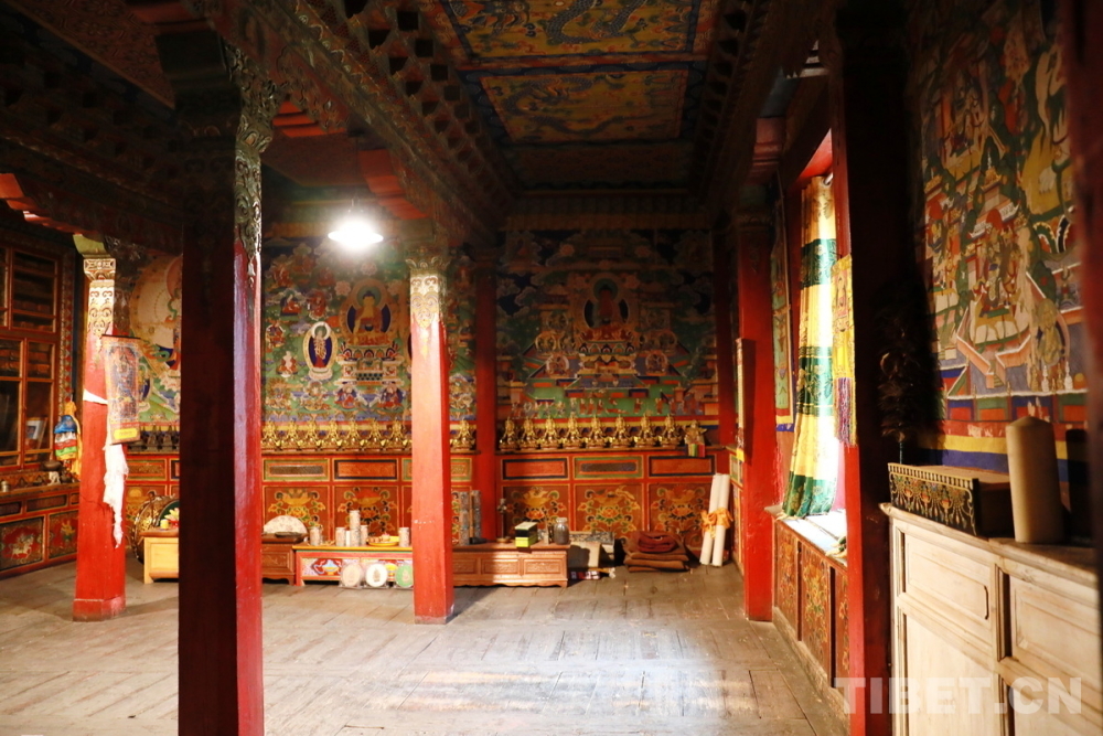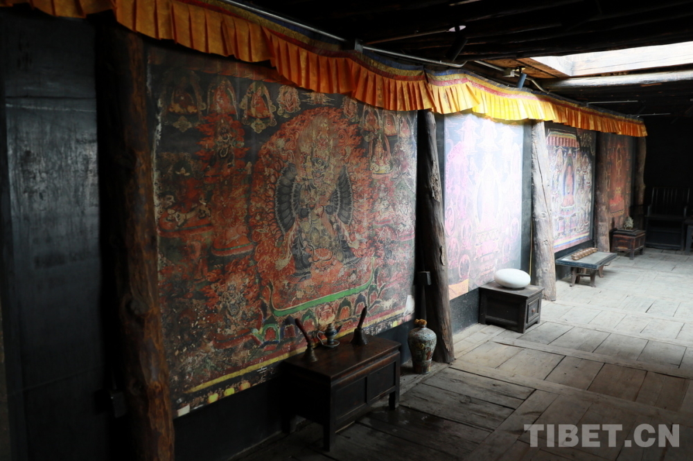 宗薩木府最驚艷的是其經(jīng)堂中歷經(jīng)380余年歷史仍色彩絢麗、保存完整的整堂壁畫。新中國成立后,宗薩木府曾被收歸公有,許多無房的當?shù)刎毨罕姳话才抛∵M了這里。“文革”時期,宗薩木府的經(jīng)堂被作為村里的倉庫,人們用報紙糊住壁畫,使這些藝術珍品沒有受到“破四舊”的影響。