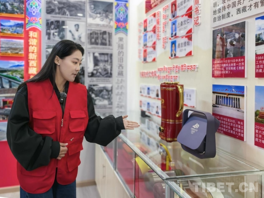 在社區(qū)回憶館內(nèi),有一排展柜精心展出了歷年來中央代表團(tuán)贈予西藏各族各界干部群眾的禮物。從西藏自治區(qū)成立三十周年時的鐘表,到西藏自治區(qū)成立六十周年時的全自動酥油茶壺,德吉措姆說這些禮物滿載著黨中央對西藏各族群眾深情厚誼,每一件禮物都是當(dāng)時各族群眾日常生活所切實(shí)需要的,禮物的變化也見證著西藏各族群眾生活的變化。