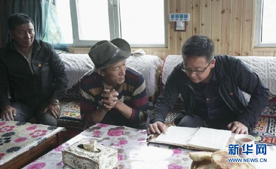 青海省玉樹藏族自治州囊謙縣覺拉鄉(xiāng)尕少村第一書記麻成學(xué)(右)在農(nóng)牧民家中走訪(2019年8月30日攝)。新華社記者 李亞光 攝