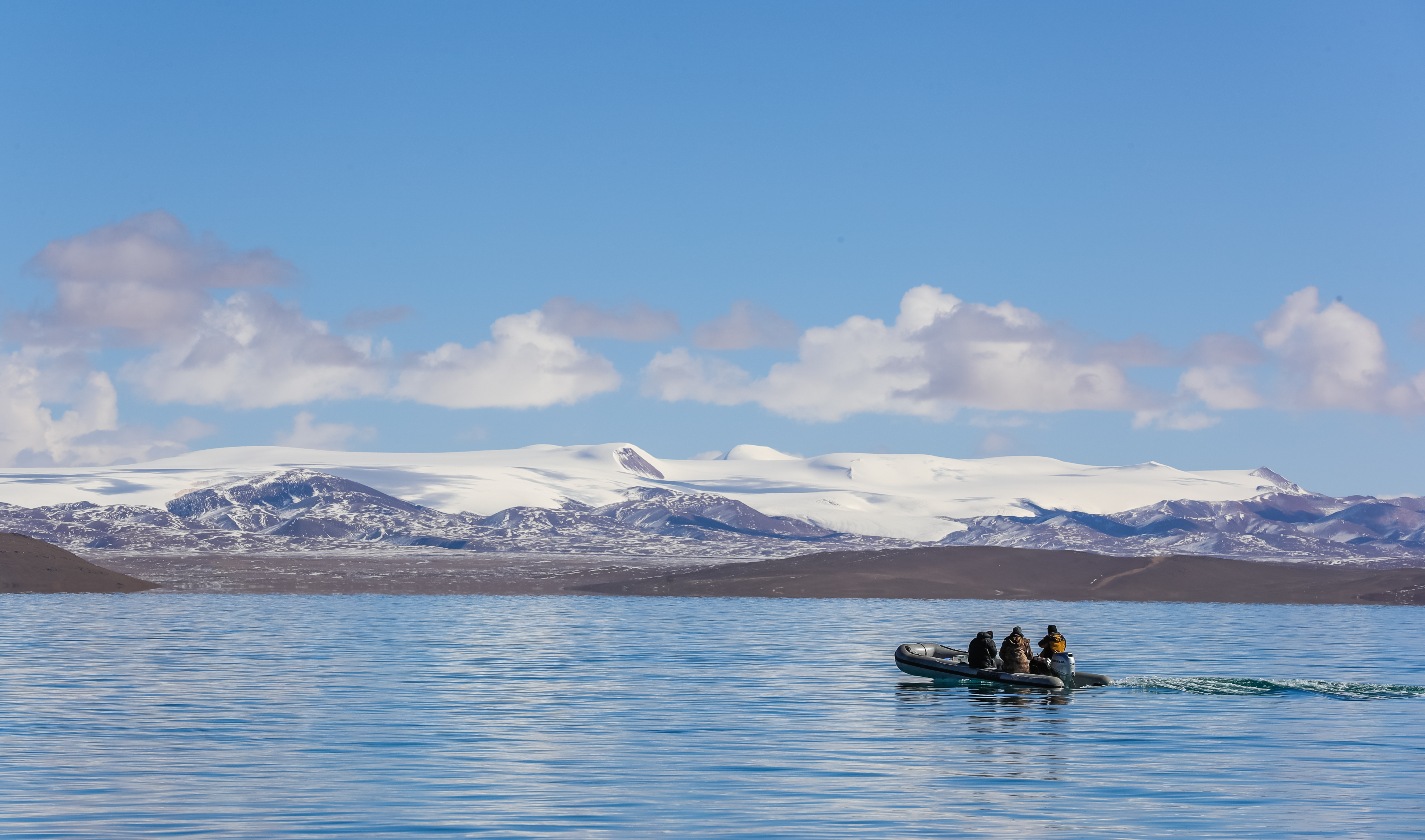 每次到達(dá)目的地后,科考人員先在距湖泊二三十米的地方扎營,架設(shè)能裝載4-5噸重設(shè)備的考察平臺。折疊的橡皮艇被展開充氣,再由七八位隊員抬著放入湖中。