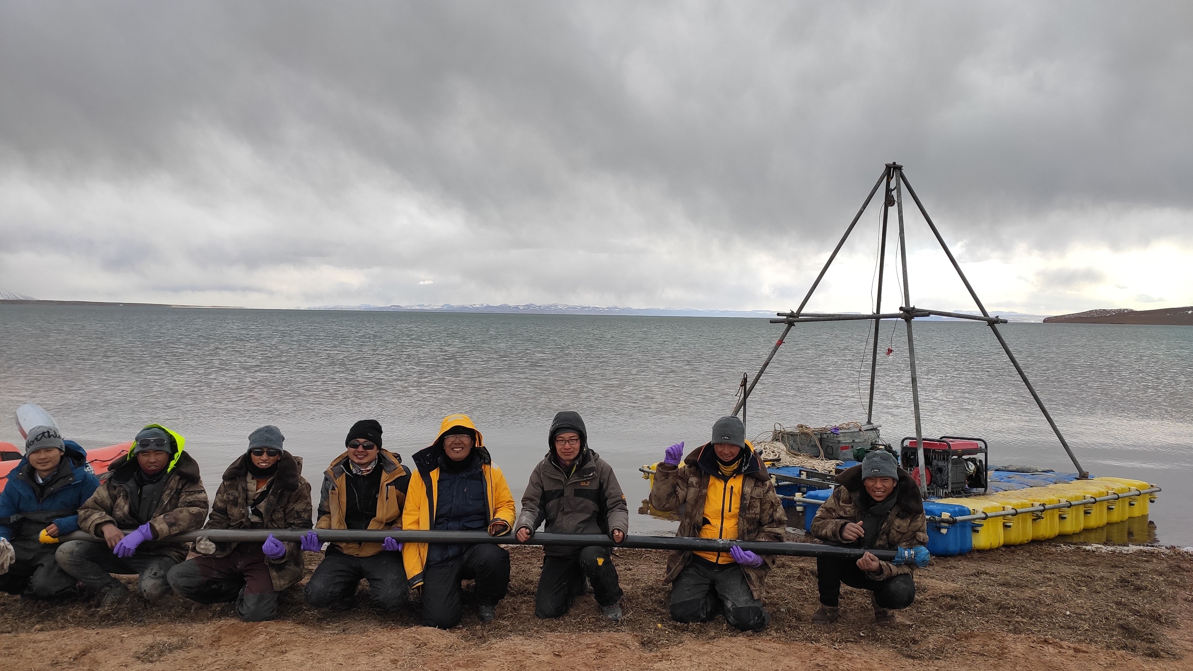 鉆取湖泊巖芯是個“力氣活”,隊員們需要協(xié)同完成下鉆、錘擊、提鉆、封管的工作??瓶既藛T用浮筒組成20平方米的采樣平臺,拋錨穩(wěn)定后將取樣管觸到湖底,通過重錘擊打使沉積物樣本進(jìn)入管中,再將重重的取樣管提起。