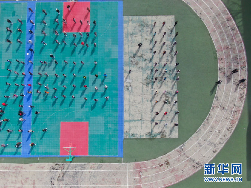 在青海省玉樹藏族自治州八一孤兒學(xué)校,學(xué)生們?cè)谶M(jìn)行課間活動(dòng)(4月3日攝,無(wú)人機(jī)照片)。新華社記者 張龍 攝