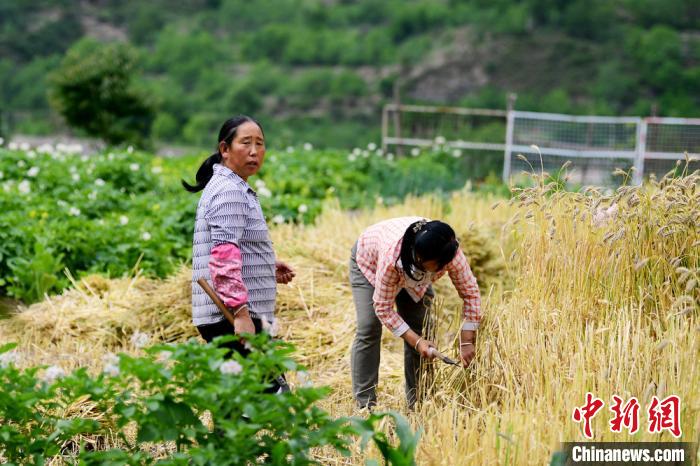 甘肅舟曲:白龍江畔麥浪翻滾收割忙