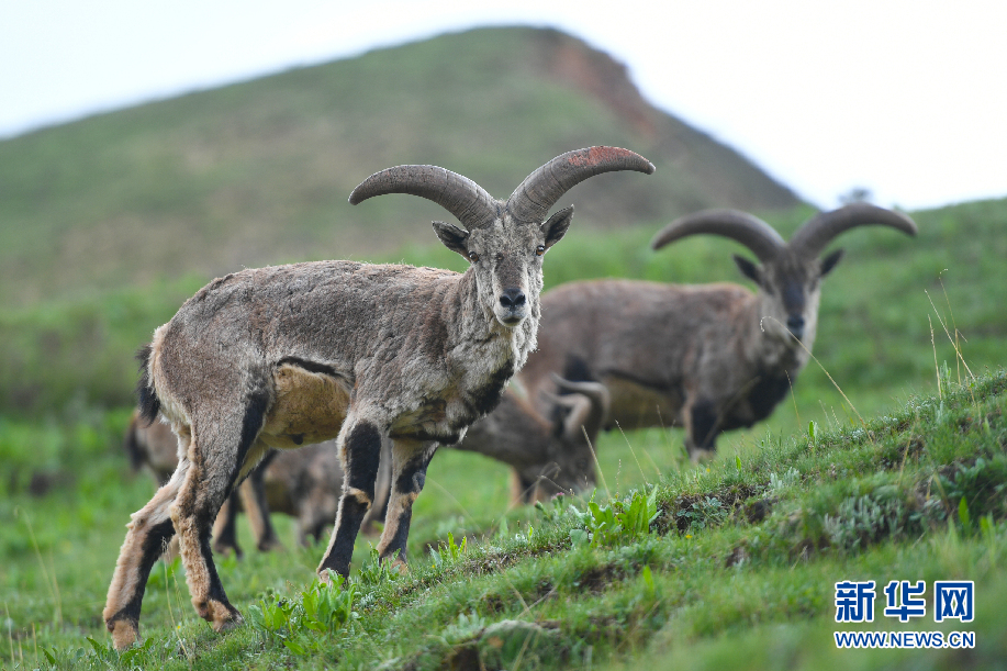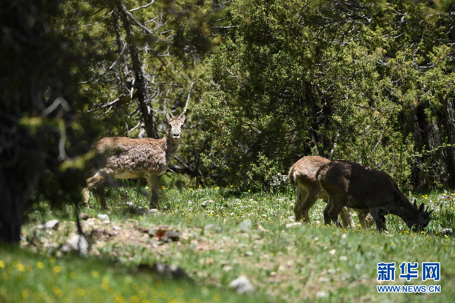 三只巖羊在囊謙縣吉尼賽鄉(xiāng)河谷的山坡上覓食。(6月20日攝)新華網 潘彬彬 攝