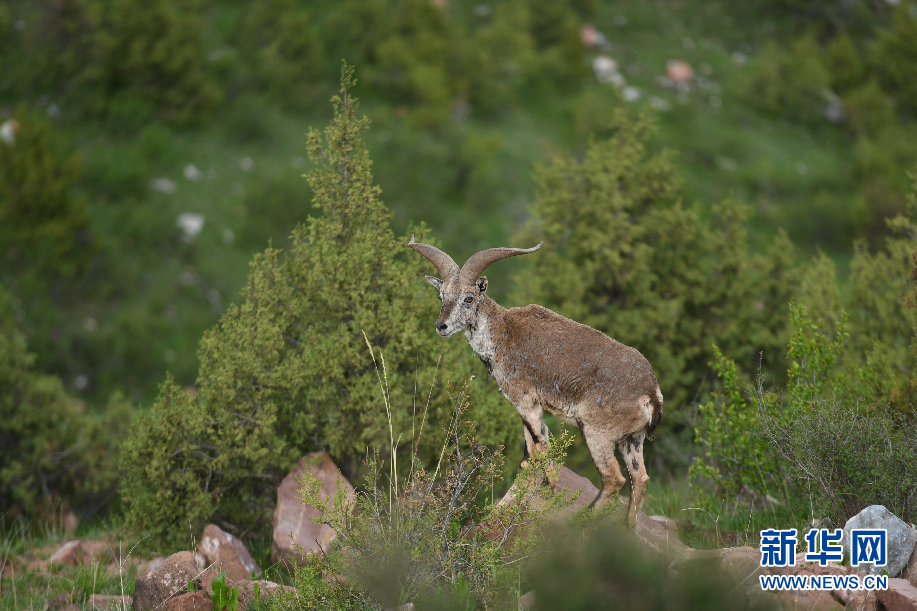 一只巖羊在囊謙縣吉尼賽鄉(xiāng)河谷的山坡上眺望。(6月20日攝)新華網 潘彬彬 攝