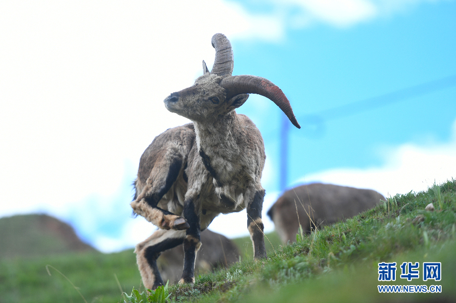 一只巖羊在囊謙縣吉尼賽鄉(xiāng)河谷的山坡上嬉戲。(6月20日攝)新華網 潘彬彬 攝