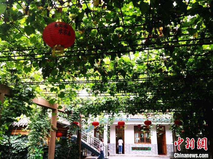 7月,中新網(wǎng)記者走進(jìn)韓謝軍的農(nóng)家樂(lè),庭院中滿是掛滿果實(shí)的葡萄架長(zhǎng)廊,葡萄枝葉連成片,濃密的樹(shù)蔭遮蔽了夏日炎炎。