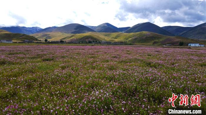 稻城縣噶通鎮(zhèn)八美村位于亞丁機(jī)場(chǎng)前往亞丁景區(qū)的交通要道上。長(zhǎng)期以來(lái),這片草原沙化現(xiàn)象日益嚴(yán)重,當(dāng)?shù)卮迕褓?lài)以生存的傳統(tǒng)放牧都難以為繼。2016年以來(lái),稻城縣利用生態(tài)治理工程實(shí)施的契機(jī),整合全域旅游和脫貧攻堅(jiān)等涉農(nóng)涉旅資金,在沙化草原上大面積種植格?;?,將1599畝沙化草地打造成色拉花海。