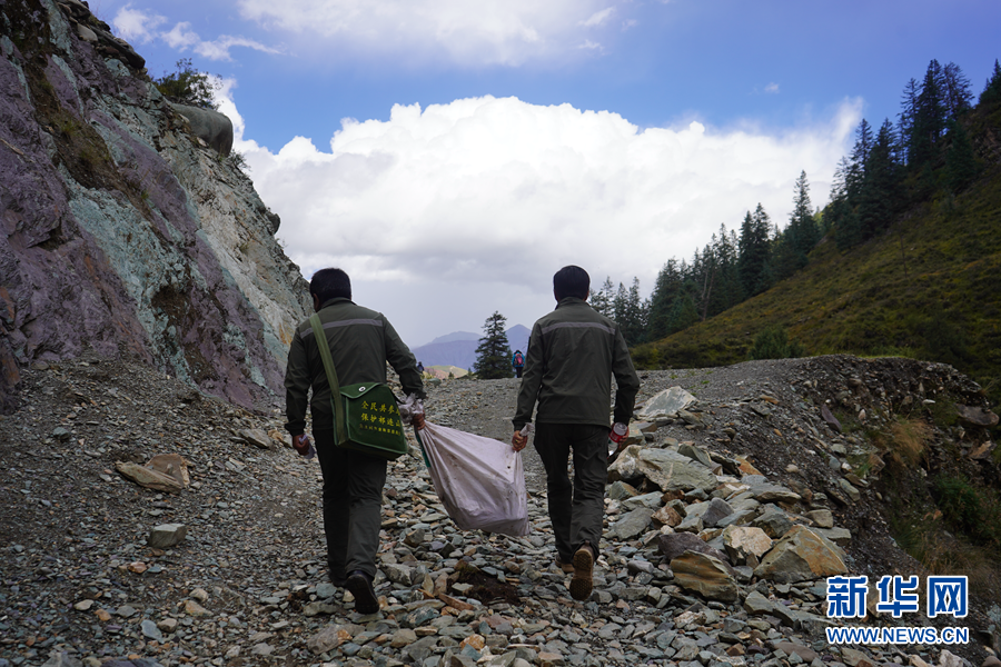 祁連山國(guó)家公園青海片區(qū)油葫蘆管護(hù)站的生態(tài)管護(hù)員在撿拾垃圾(9月9日攝)。新華社記者 藍(lán)翔 攝