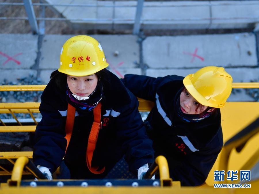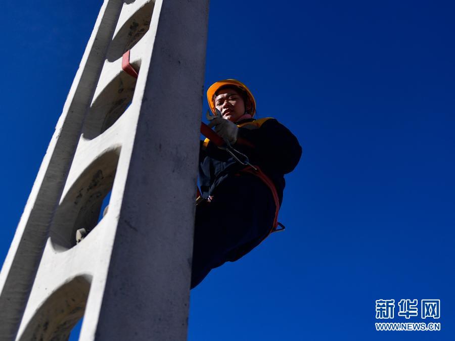2月2日,在青藏鐵路公司西寧供電段哈爾蓋工區(qū)負(fù)責(zé)鐵路線上,羅露露在攀登接觸網(wǎng)支柱。新華社記者 張龍 攝