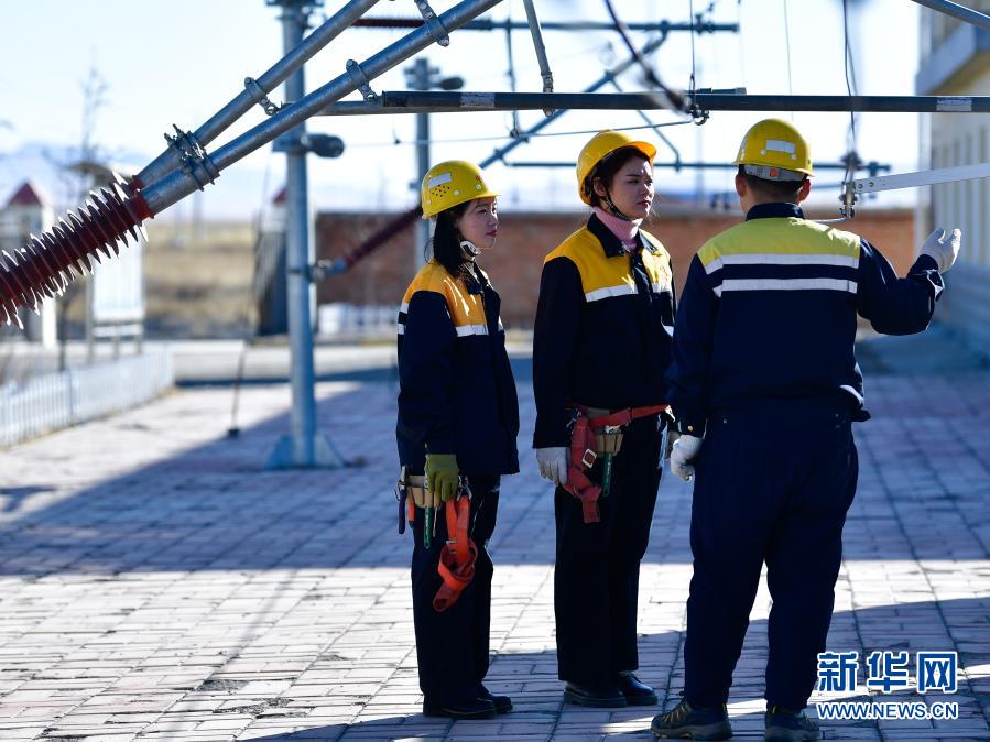 2月2日,在青藏鐵路公司西寧供電段哈爾蓋工區(qū),郭勝強(qiáng)(左)與羅露露(中)在聽老職工講解安全知識?!⌒氯A社記者 張龍 攝