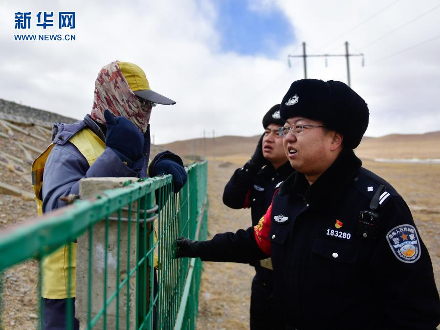 2月4日,沱沱河站派出所巡線民警田長(zhǎng)松(右)在巡線途中向青藏鐵路公司格爾木工務(wù)段唐古拉線路車(chē)間養(yǎng)路工人了解情況。新華社記者 張龍 攝