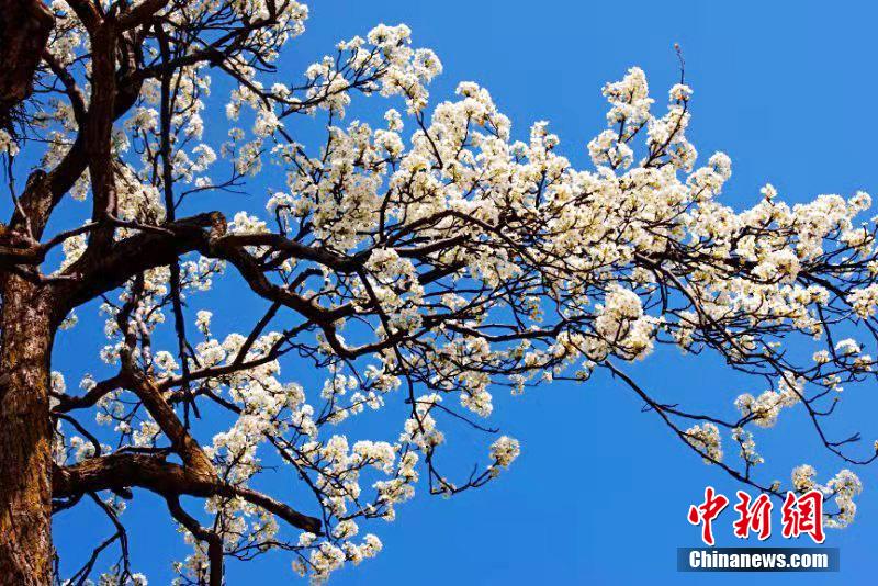 近日,四川省阿壩州金川縣萬畝梨花綻放,滿山遍野,雪白的梨花,隨風飄絮,藍天白云,花海飄香,令人陶醉,吸引眾多游客前來游覽、拍照。代永清 攝