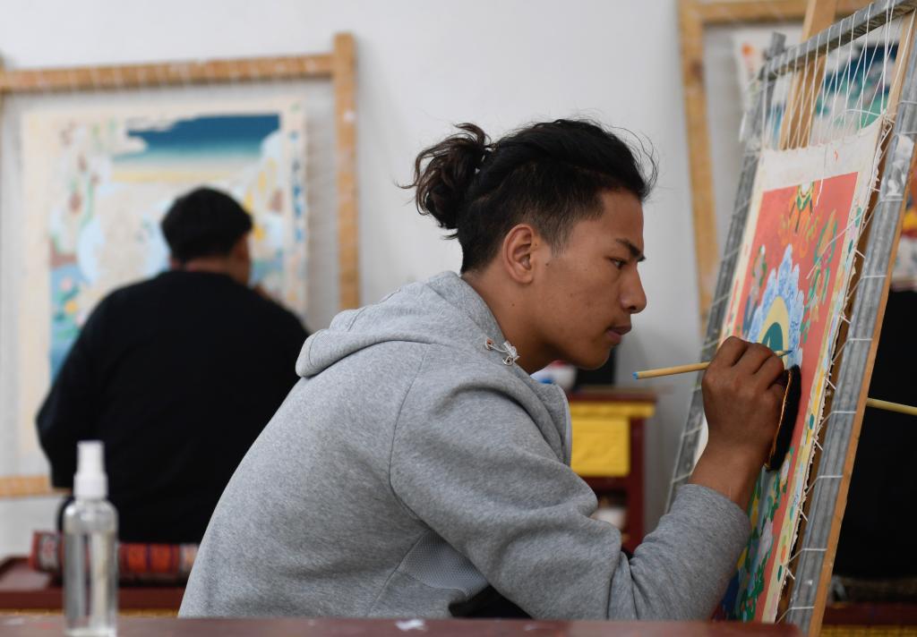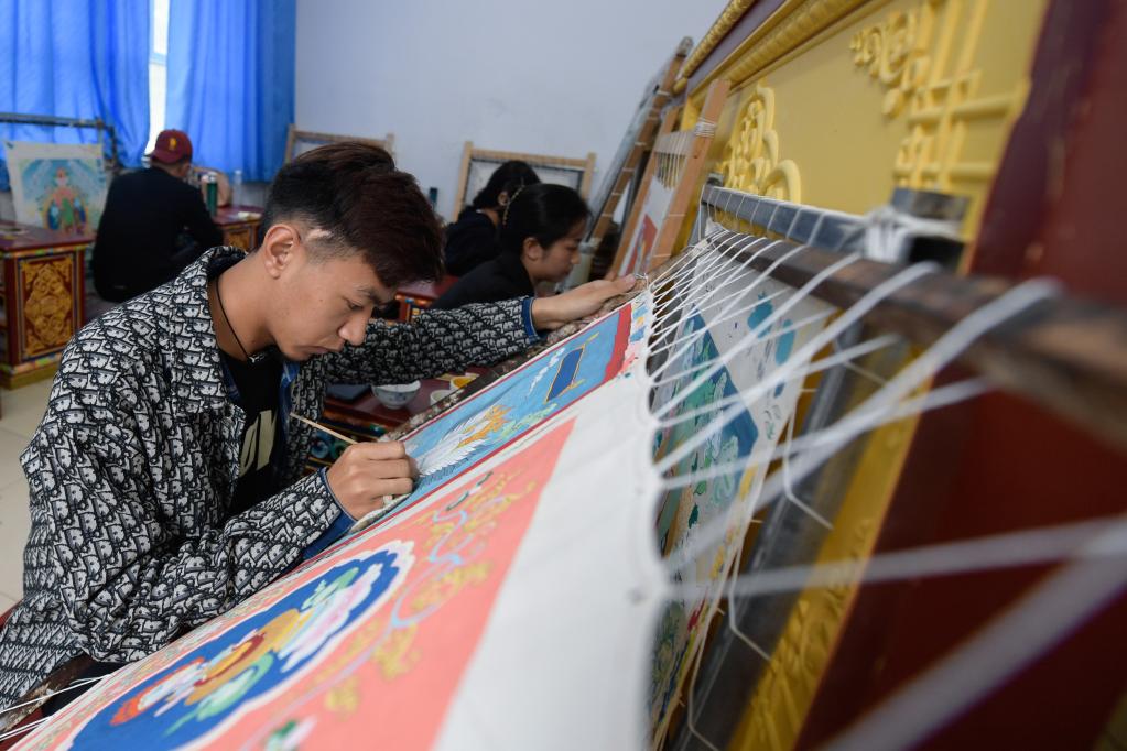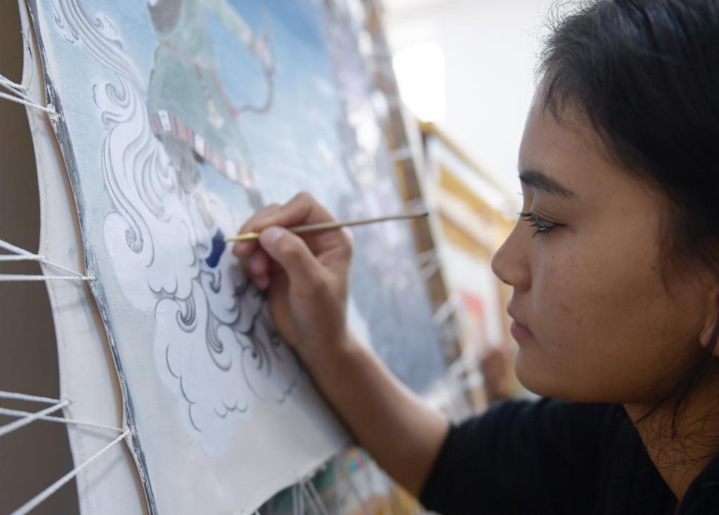 6月17日,在青海民族大學(xué)藝術(shù)學(xué)院,工藝美術(shù)(唐卡)專(zhuān)業(yè)學(xué)生在繪制唐卡。新華社記者 張曼怡 攝