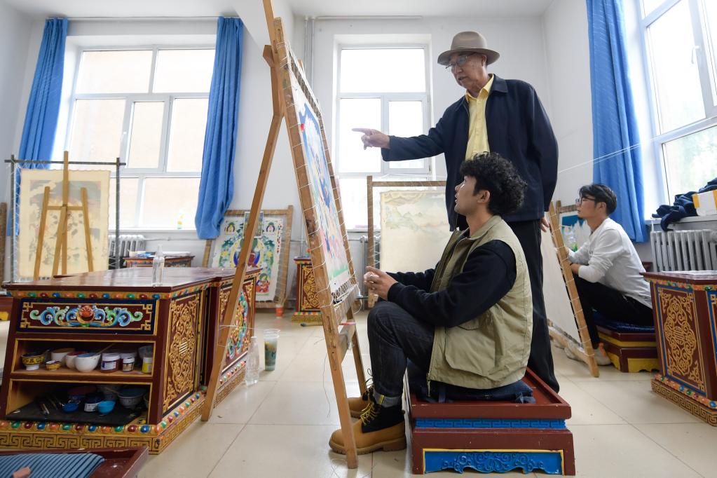 6月17日,在青海民族大學(xué)藝術(shù)學(xué)院,老師夏吾才讓?zhuān)ㄖ校┰谥笇?dǎo)工藝美術(shù)(唐卡)專(zhuān)業(yè)學(xué)生繪制唐卡。新華社記者 張龍 攝